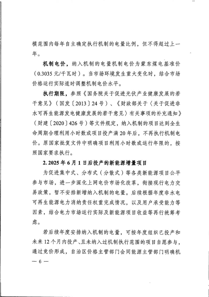 针对2025年6月1日后投产的新能源增量项目,《方案》提出,暂不安排新增纳入机制的电量。后续根据年度非水电可再生能源电力消纳责任权重完成情况,以及用户承受能力等因素,结合电力市场运行实际及新能源项目收益等再行统筹考虑。