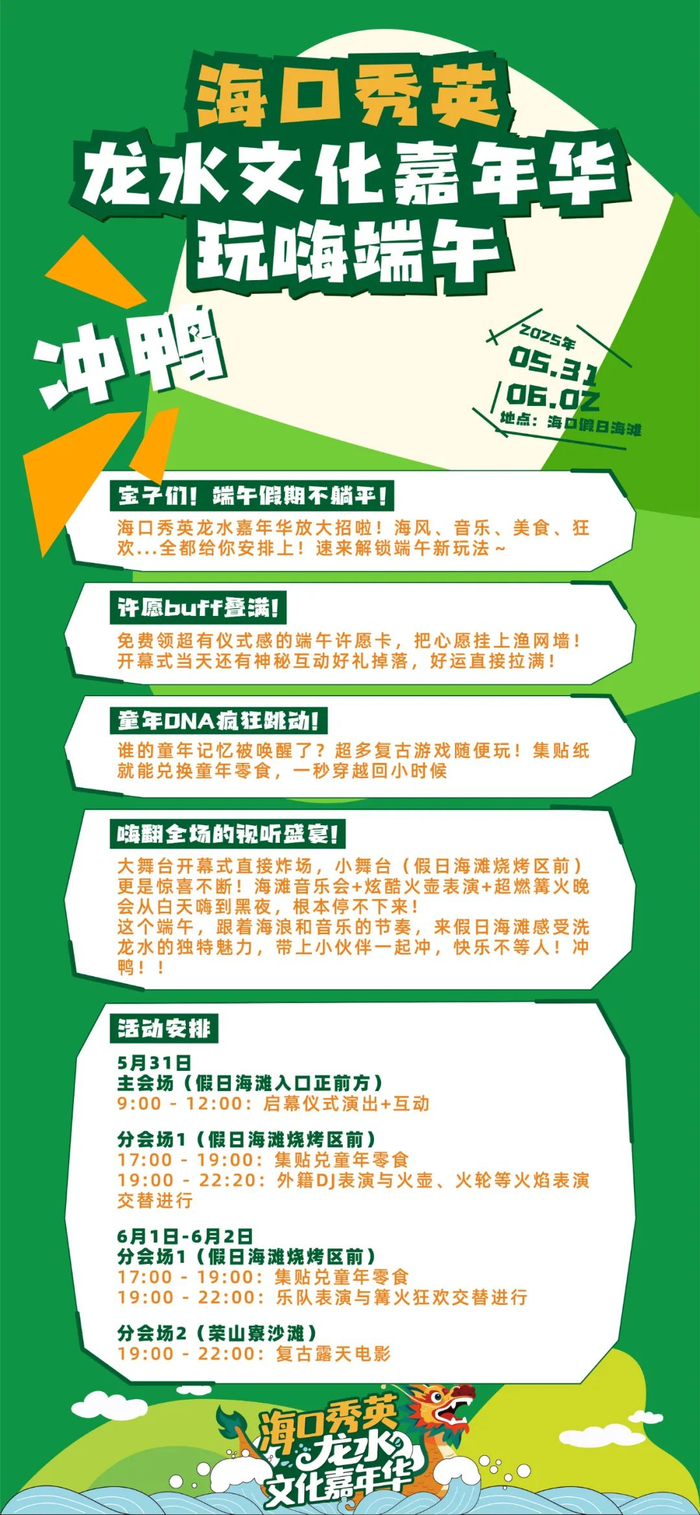 为了让“洗龙水”变得更有仪式感,推动本土优秀传统文化传承发展。由海口市秀英区旅游和文化体育局主办的2025年秀英区龙水文化嘉年华活动将于5月31日至6月2日在假日海滩举办。届时,市民游客可参与祈福仪式、龙水共沐等民俗活动,感受传统文化的深厚底蕴。现场还将开展“重拾青春记忆”假日海滩沙滩音乐烧烤派对。
