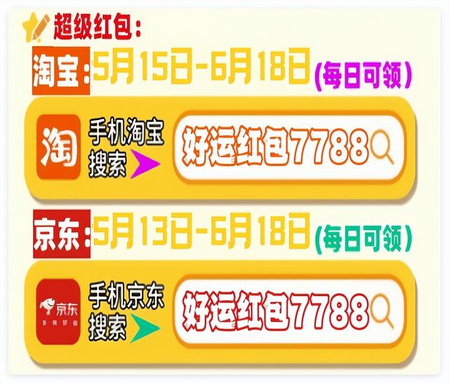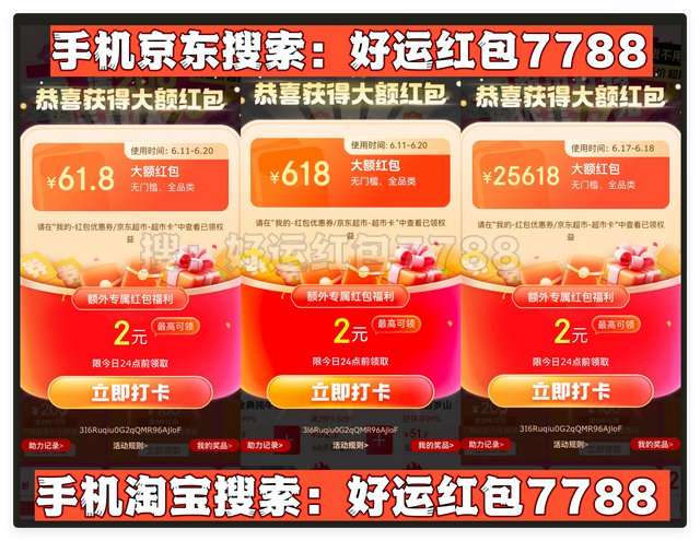 首先,划重点!今年天猫/淘宝和京东的618红包口令都是「好运红包7788」要记住!领的红包大小和你搜索的什么口令有关的!这个双平台通用口令包领到大的!记得每天去领!