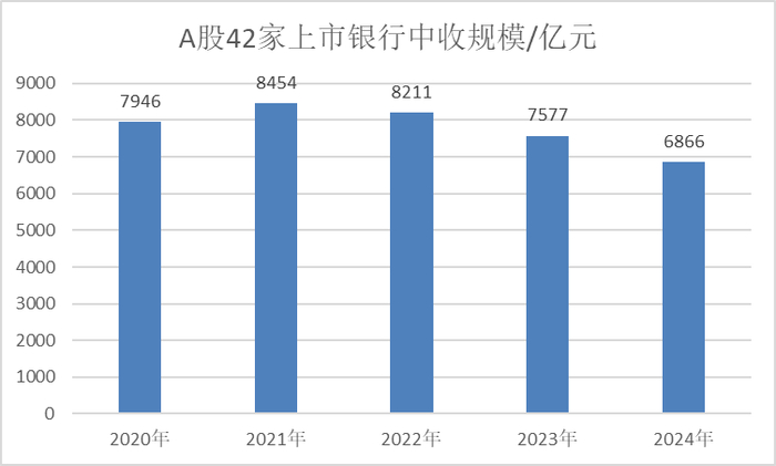 从规模看,A股42家银行于今年一季度的中间收入约2268亿元,低于去年同期的2284亿元。券商中国记者梳理年报发现,自2021年起,A股上市银行中间收入规模整体呈现下降走势。