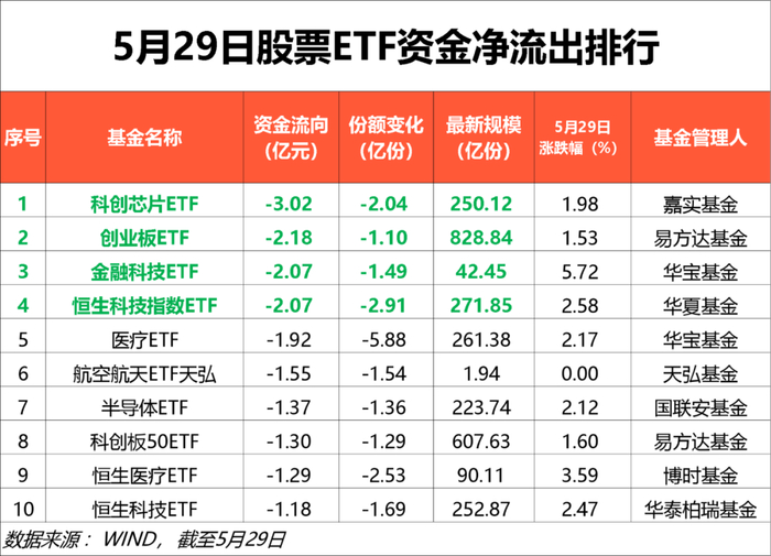 资金净流出方面,科创芯片ETF以3.02亿元的资金净流出居前,创业板ETF、金融科技ETF、恒生科技指数ETF等资金净流出也较多。