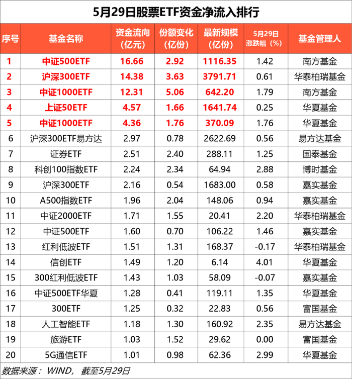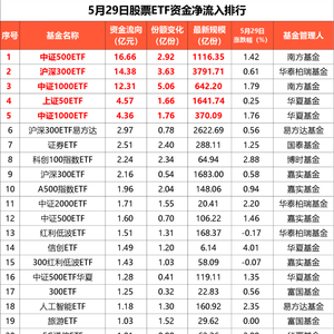 易方达基金数据显示,5月29日,跟踪沪深300指数的ETF单日净流入居前,达22.6亿元;跟踪中证500、中证1000指数的ETF单日净流入分别达20.2亿元和18.9亿元,跟踪中证A500和上证50指数的ETF单日净流入为5亿元和4.9亿元。