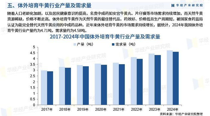 随着人口老龄化加剧,以及居民健康意识的提高,名贵中成药如安宫牛黄丸、片仔癀等市场需求持续增加,而天然牛黄资源稀缺,价格不断走高。体外培育牛黄作为天然牛黄的最佳替代品,药效好、价格低且生产周期短,被国家食药监局认证为能完全替代天然牛黄应用的中成药品种。近年来体外培育牛黄的市场需求持续增长,据统计,2024年我国体外培育牛黄行业产量约为4.71吨,需求量约为4.58吨。