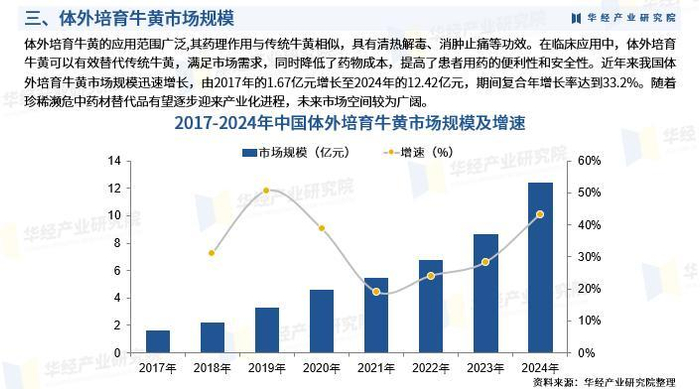 体外培育牛黄的应用范围广泛,其药理作用与传统牛黄相似,具有清热解毒、消肿止痛等功效。在临床应用中,体外培育牛黄可以有效替代传统牛黄,满足市场需求,同时降低了药物成本,提高了患者用药的便利性和安全性。近年来我国体外培育牛黄市场规模迅速增长,由2017年的1.67亿元增长至2024年的12.42亿元,期间复合年增长率达到33.2%。随着珍稀濒危中药材替代品有望逐步迎来产业化进程,未来市场空间较为广阔。