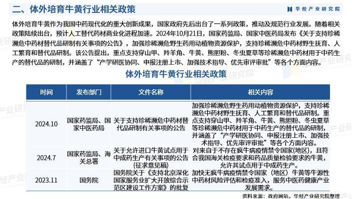 体外培育牛黄作为我国中药现代化的重大创新成果,国家政府先后出台了一系列政策,推动及规范行业发展。随着相关政策陆续出台,预计人工替代药材商业化进程加速。2024年10月21日,国家药监局、国家中医药局发布《关于支持珍稀濒危中药材替代品研制有关事项的公告》,加强珍稀濒危野生药用动植物资源保护,支持珍稀濒危中药材野生抚育、人工繁育和替代品研制。该公告提出,重点支持穿山甲、羚羊角、牛黄、熊胆粉、冬虫夏草等珍稀濒危中药材用于中药生产的替代品的研制。