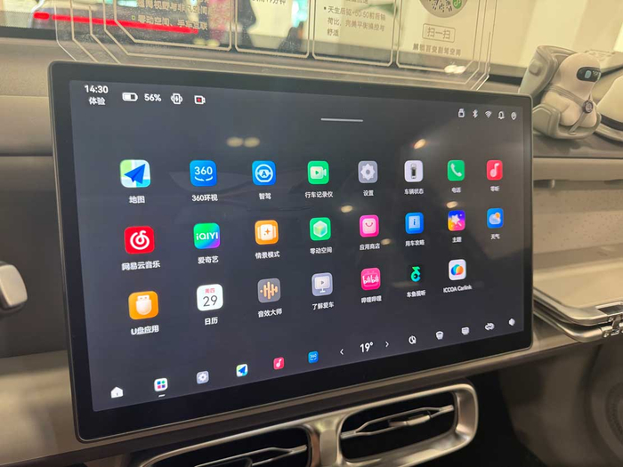 展车为售价10.98万元的510悦享版车型,采用8155芯片。中控屏的UI设计简洁,操作较为流畅,拖拽地图或进入车载APP会有轻微卡顿。