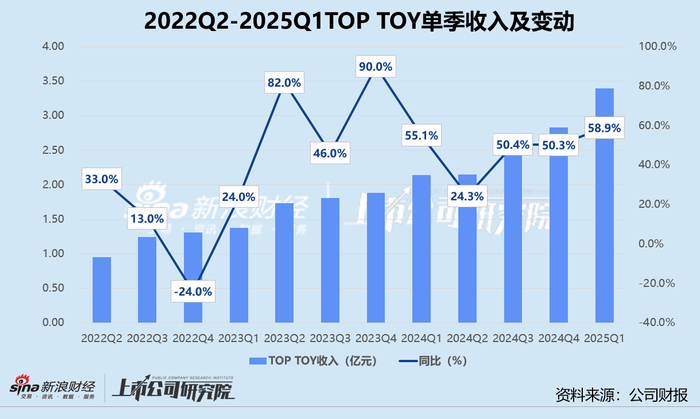 就业绩表现而言,TOP TOY的营收稳健增长。不到三年的时间,单季收入便从9500万元涨至3.40亿元,年复合增长率达53.0%。尤其2024年第三季度至2025年第一季度,TOP TOY连续三个季度收入同比增速超过50%,为集团总营收的贡献比例稳定在6%-7%之间。