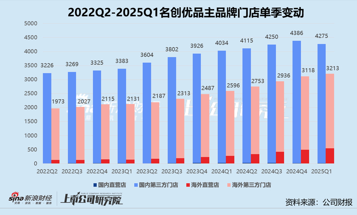 截至2025年3月31日,公司集团层面的门店总数达到7768家,同比净新增978家。主品牌名创优品门店共7488家,较2024年同期净增长858家,但内地门店仅净新增241家,海外新增门店数占比约71.9%。分渠道模式来看,名创优品的内地直营店数量不增反降,同比、环比分别净减少31.0%、20.0%;合伙人和代理门店合计净新增250家,与2024年末相比净减少106家。