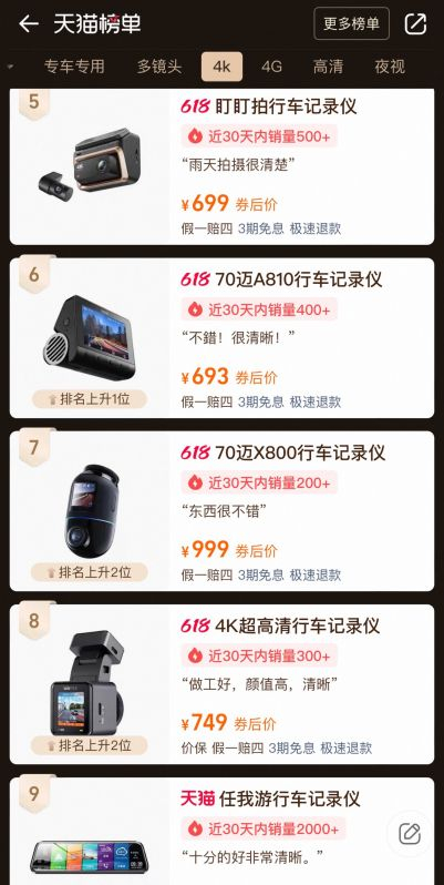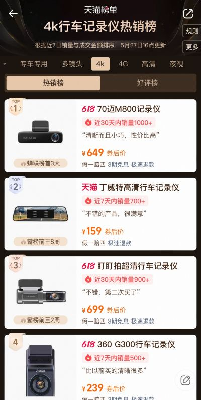 360 G900行车记录仪位居天猫618 4K行车记录仪热销榜TOP4,其具备4K超高清分辨率,搭载第四代鹰眼夜视技术,F1.8大光圈搭配7组镜头,日夜拍摄均清晰。内置AI双核芯片,配备AI智能伴驾2.0,拥有前车碰撞提醒、行人识别等多重驾驶辅助功能。支持5G WiFi,视频传输速度提升5倍,还配备行车轨迹AI检索功能,方便用户快速查找所需视频。