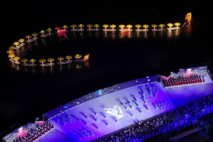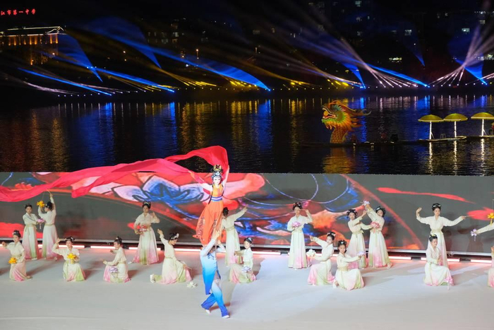 当晚,一场融合文艺、科技与文化魅力的水陆空视觉盛宴震撼上演。超千人的演出团队带来资中木偶戏、沱江船工号子等多个独具地方特色的文艺节目。演出中,穿插无人机秀、激光秀、火壶铁花等表演,让观众大饱眼福。