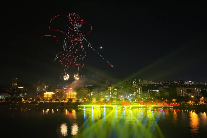 科技和文化共舞,是本届大千龙舟经贸文化博览会的一大亮点。超过2000架次的无人机编队不断变换着阵型,一会儿组成了栩栩如生的凤凰,一会儿又拼成了内江的城市轮廓……现场观众纷纷拿出手机,记录下这精彩的一刻。