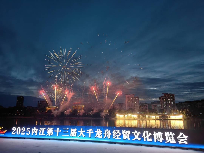 5月29日晚,当暮色降临,一弯新月挂在天上,内江甜城湖畔,突然被璀璨的灯光点亮,冷焰瀑布、高空焰火交织,让人目不暇接。2025年内江第十三届大千龙舟经贸文化博览会拉开了序幕,内江人开启了端午节前的狂欢。