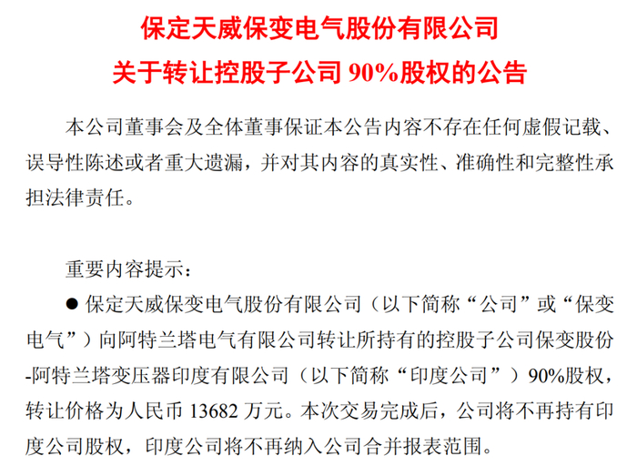 5月29日,保变电气(600550)发布公告,宣布向阿特兰塔电气有限公司转让控股子公司保变股份-阿特兰塔变压器印度有限公司(以下简称保变印度)90%股权,转让价格约为1.37亿元。此次交易完成后,公司将不再持有印度公司的股权,该公司也将不再纳入公司的合并报表范围。