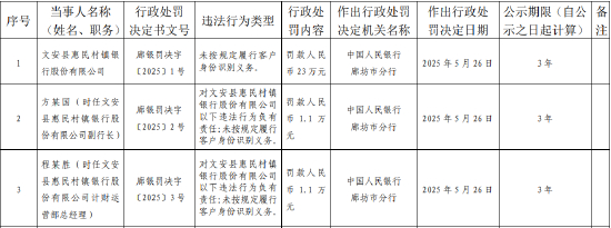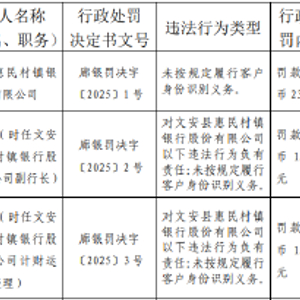 文安县惠民村镇银行被罚23万元:未按规定履行客户身份识别义务