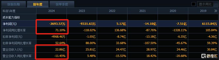 2024年营收为22.86亿元,同比下滑11.45%;净利润为-2693.57万元,同比增71.1%。