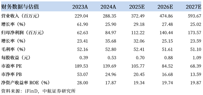 基于以上观点,我们预计公司2025-2027年的营业收入分别为3.72亿元、4.75亿元和5.94亿元,归母净利润分别为1.12亿元、1.40亿元及1.74亿元,EPS分别为0.70元、0.88元、1.09元。首次覆盖,给予“买入”评级,当前股价分别对应2025-2027年106倍、85倍及68倍PE。