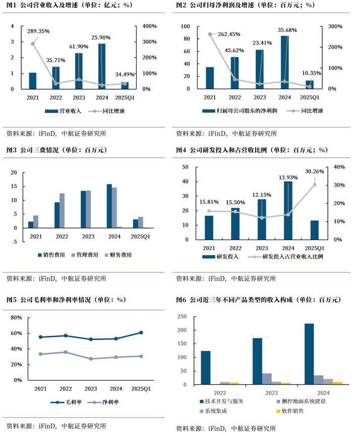 研发投入方面,2024年公司研发投入总额(0.40亿元,+44.39%)显著增长,公司研发人员数量(45人,+60.71%)显著提升,主要的研发项目有面向商业卫星星座的协同应用技术、商业卫星星座综合管控系统研制、卫星数字工程设计与仿真工业软件关键技术、星座集群跨域协同验证平台等。2025年公司持续加大研发投入,2025Q1研发投入总额(0.13亿元,+68.71%)持续增长。