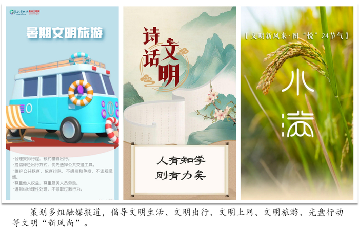 策划推出《贵州省文明行为促进条例公益动画》《文明养成从我做起》等MG动画,倡导文明生活、文明出行、文明上网、文明旅游、光盘行动等;策划“文明新风来·图‘悦’24节气”,以手绘动态海报描绘节气特点,融入精神文明建设、文化传承、生态保护等方面的积极探索与生动实践;推出“诗话文明”品牌栏目,以古文与古诗词为媒介,解读蕴含的中华传统美德内涵,从古籍里看文明之道,悟文明之理,感受中华传统文化的魅力与力量;在省精神文明办指导下,办好“贵州文明网”“文明贵州”官微。