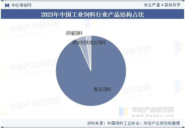 从中国工业饲料行业产品结构来看,配合饲料占比最重占比超过90%。配合饲料是指根据不同动物的营养需求,按照科学配方将多种原料混合加工而成,能够满足动物全部或主要营养需求的饲料。这种饲料通常包含谷物、蛋白质源、矿物质、维生素和其他添加剂。