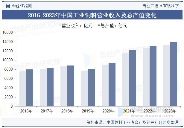 中国是全球最大的工业饲料生产国和消费国。随着养殖业的持续发展,工业饲料的市场规模不断扩大。得益于农业现代化进程和养殖业的快速发展,工业饲料行业保持了稳定的增长速度,年均增长率在3%至5%之间。2023年中国工业饲料行业营业收入为14018.3亿元,总产值为13304.41亿元。