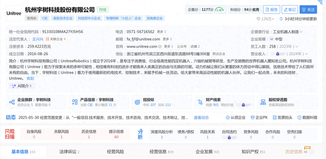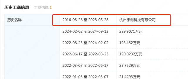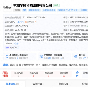 记者通过调查发现,目前,企查查上显示宇树科技的公司名称已经变更为杭州宇树科技股份有限公司,工商历史信息显示,自2016年08月26日至2025年05月28日其一直使用的是杭州宇树科技有限公司作为公司名称。同时,公开信息显示,宇树科技成立于2016年,法定代表人为王兴兴,注册资本约259.42万人民币,经营范围含智能机器人的研发、智能机器人销售、工业机器人制造等,由王兴兴、汉海信息技术(上海)有限公司等共同持股。