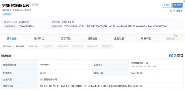 记者调查发现,今年3月,宇樹科技有限公司(英文名Unitree Robotics Limited)在香港成立,企业类型为私人股份有限公司。近年来,香港特区政府力推“科技企业赴港计划”。港交所2024年修订的《上市规则》第18C章允许未盈利科技企业上市,自修订《上市规则》第18C章以来,截至2024年末,已有晶泰控股、越疆科技等科技公司以该规则成功上市。