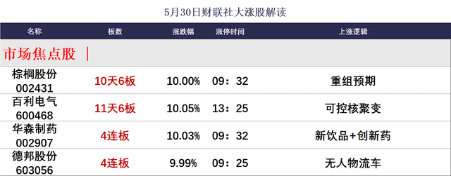 财联社5月30日讯,今日42股涨停,21股炸板,封板率为67%,德邦股份、华森制药、4连板,御银股份、联化科技3连板,北交所路桥信息30CM2连板,棕榈股份10天6板,百利电气11天6板。市场全天震荡调整,创业板指领跌。本月市场走出先扬后抑走势,三大指数月线均收涨,其中沪指本月累计涨超2%。今日沪深两市全天成交额1.14万亿,较上个交易日缩量462亿。板块方面,猪肉、创新药、银行、CRO等板块涨幅居前,黄金、草甘膦、可控核聚变、人形机器人、环保设备、消费电子等板块跌幅居前。截至收盘,沪指跌0.47%,深成指跌0.85%,创业板指跌0.96%。