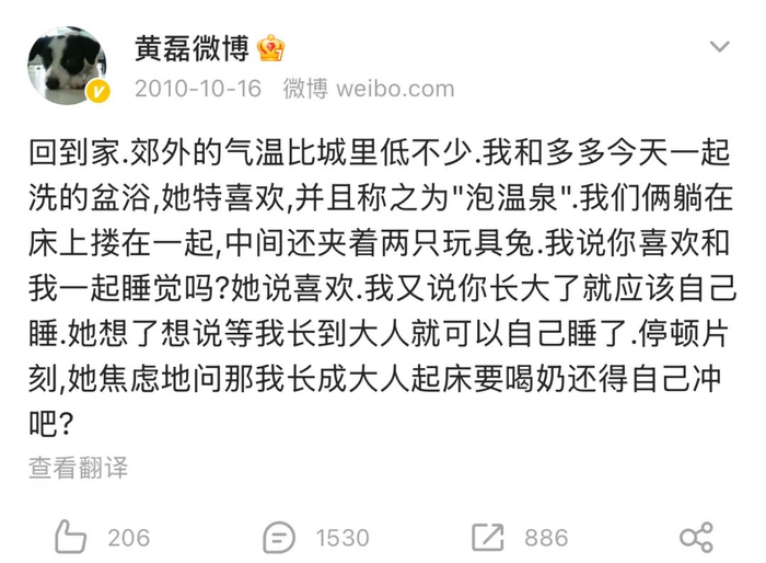 2010年10月16日,黄磊第一次在微博更新了黄多多的日常碎片,当时的黄多多年仅4岁,喜欢依偎着父亲睡觉,黄磊则教导她长大了就应该自己睡。