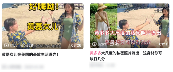她在美国留学时,更是因身穿泳装、表情张扬,引发了一场大规模的互联网躁动,许多人开始对她的留学生涯浮想联翩,各种千奇百怪的谣言在全网流传。哪怕造谣的人在现实生活中完全不认识黄多多,可对他们而言,仅凭这几张图便足够了。