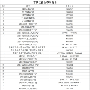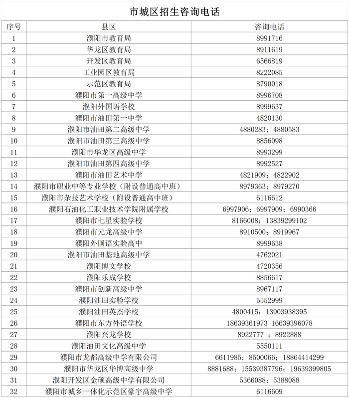 今年,濮阳市各级教育行政部门、市城区各普通高中继续开通热线,为家长答疑解惑,有疑问的家长可拨打以下电话咨询: