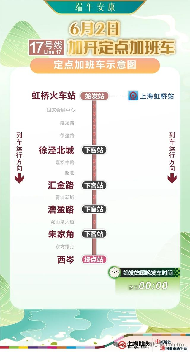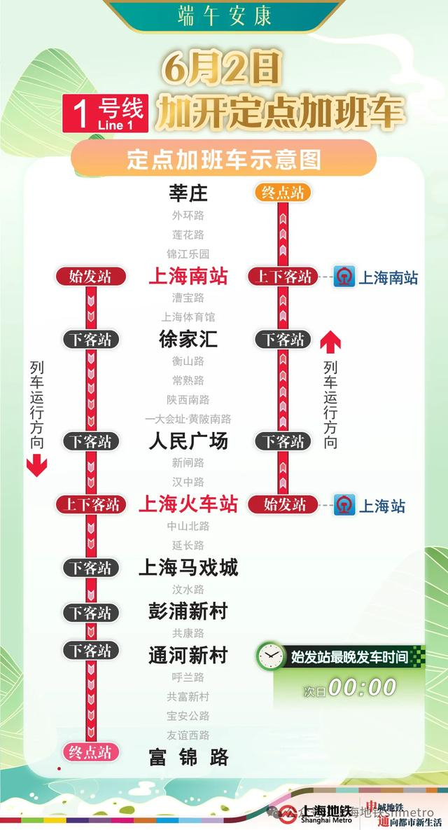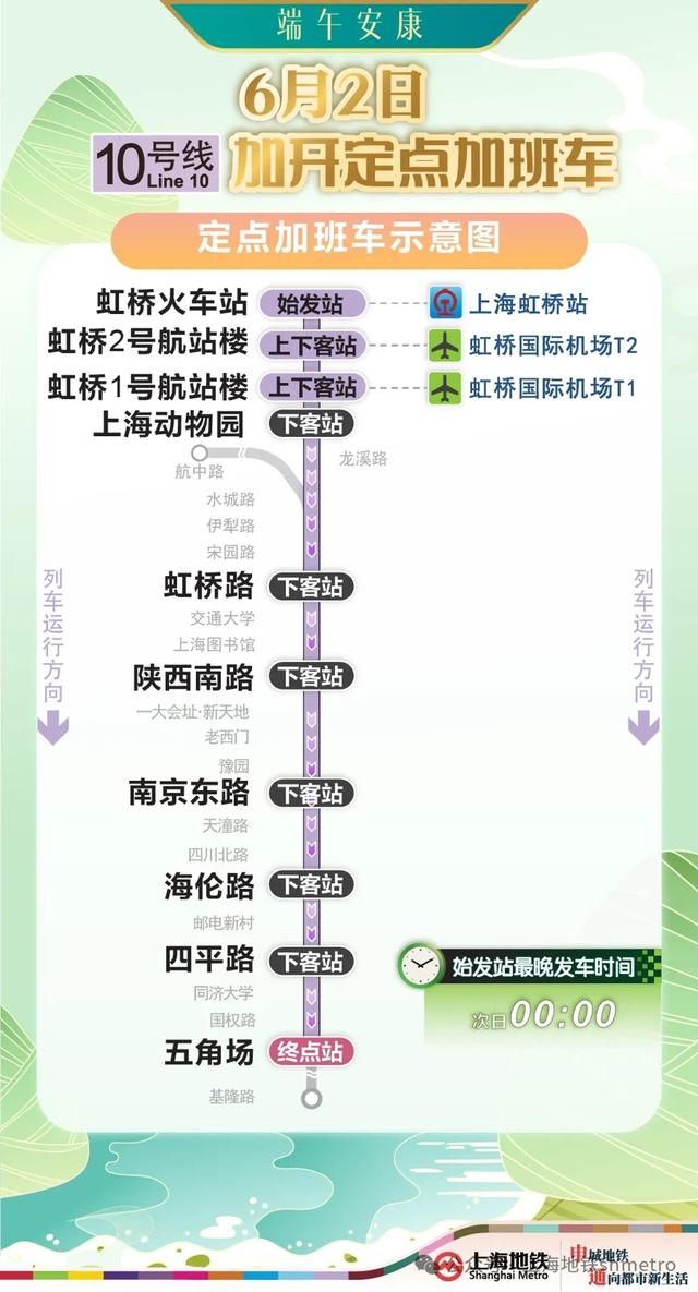 为缓解中心城区夜高峰休闲、购物客流密集的压力,做好虹桥火车站夜间列车集中到达大客流疏散工作,6月2日假期最后一天,1、2、10、17号线实施定点加开方案,均加开末班车延长至次日0点: