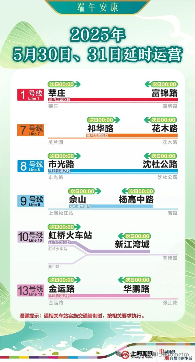 5月30日、31日,上海地铁1、7、8、9、10、13号线六条线路,实施常态周五周六延时运营。
