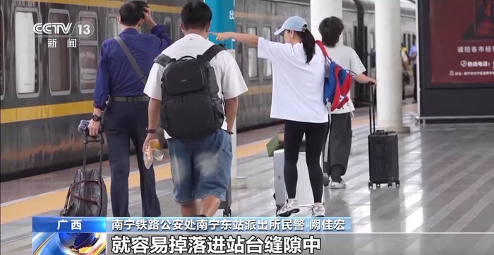 南宁铁路公安处南宁东站派出所民警 阙佳宏:站台边缘与列车之间一般留有15厘米左右的缝隙,对成年人一般不会造成影响,但儿童身材娇小、天性活泼好动、情绪易兴奋,并且好奇心强,可能会凑近观察或者触摸站台上设施设备、停靠列车等,对危险认知不足,所以在站台奔跑、跳跃或者上下车时家长缺乏看管,就容易掉落进站台缝隙中。