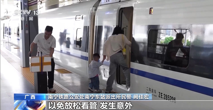 南宁铁路公安处南宁东站派出所民警 阙佳宏:出行时,家长要时刻看护好自己的孩子,牵住孩子的手腕,避免其脱离视线。也不要在站台上有使用手机、与他人聊天等分心的行为,以免放松看管、发生意外。在平时要加强安全教育,为孩子讲解乘车安全知识,如 “站在黄色线后”“站台上不奔跑、不攀爬”等,树立基本的安全认知。一旦发生意外情况,一定不要慌张,站台上均有工作人员值守,要及时向工作人员寻求帮助。