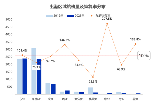 相比之下,到欧洲的航班恢复率为97.7%,到北美洲的航班恢复率只有28.3%,而这些区域则是疫情前国内航司主要开飞的国际航线目的地。