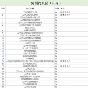 古文化街旅游区(津门故里)、盘山风景名胜区、平津战役纪念馆、泰达航母主题公园等95家日常游客不超过最高承载量的A级旅游景区免预约(其中平津战役纪念馆等10家景区面向团体需预约)。