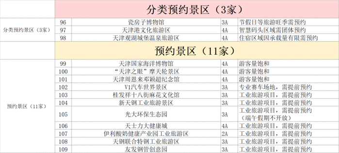 常年游客超景区最大承载量的国家海洋博物馆、周恩来邓颖超纪念馆、“天津之眼”摩天轮等热点景区和V1汽车世界景区(专业赛事场地)共4家景区实施预约或错峰预约;桂发祥十八街麻花文化馆、天士力大健康城、光大环保生态园、新天钢工业旅游景区、伊利酸奶健康产业园工业旅游区、天钢联合特钢工业旅游区、友发钢管创意园等7家景区工业旅游项目实施预约。