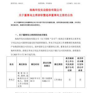 2024年5月30日晚,珠海华发实业股份有限公司(华发股份,600325.SH)发布公告称,公司董事局主席李光宁因工作调整调任珠海科技产业集团有限公司负责人,申请辞去公司董事局主席、董事及在公司担任的其他所有职务,辞职后李光宁不再担任公司及下属子公司任何职务,辞职报告自2025年5月30日起生效。同时,华发股份于当日召开的第十届董事局第五十六次会议审议通过了《关于选举公司董事局主席的议案》,选举董事局副主席郭凌勇为董事局主席,任期与本届董事局任期一致。