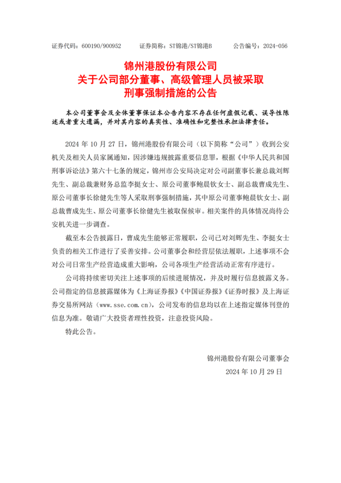10月27日,ST锦港收到公安机关及相关人员家属通知,因涉嫌违规披露重要信息罪,锦州市公安局决定对公司副董事长兼总裁刘辉、副总裁兼财务总监李挺、原公司董事鲍晨钦、副总裁曹成、原公司董事长徐健等人采取刑事强制措施,其中原公司董事鲍晨钦、副总裁曹成、原公司董事长徐健被取保候审。