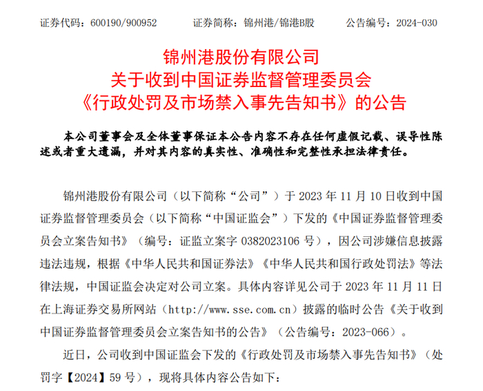锦州港股份有限公司(以下简称锦州港或公司)涉嫌信息披露违法违规一案, 已由我会调查完毕,我会依法拟对你们作出行政处罚,对徐健、刘辉采取市场禁 入措施。现将我会拟对你们作出行政处罚,对徐健、刘辉采取市场禁入措施所根 据的违法事实、理由、依据及你们享有的相关权利予以告知。