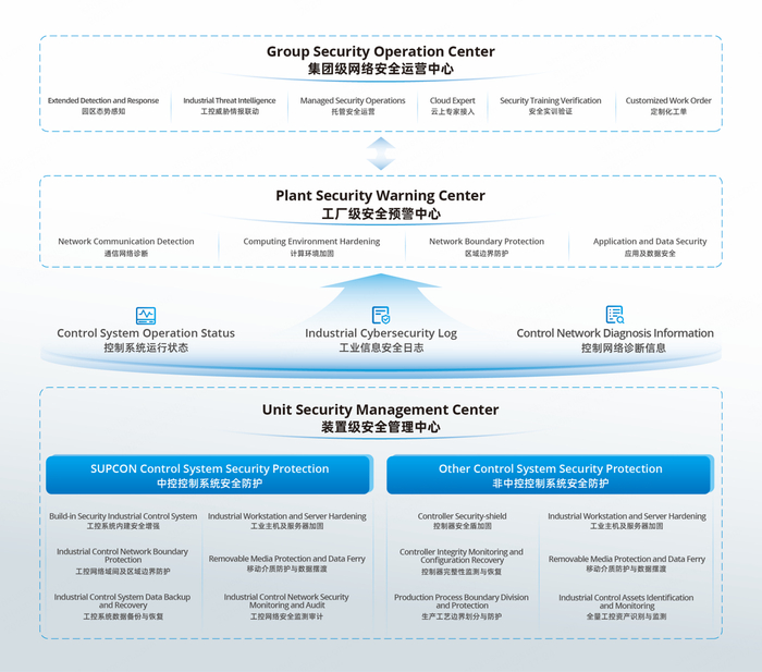 “1+1+2”三级运营体系包括1个集团级安全运营中心、1个工厂级安全预警中心及2个装置级安全管理中心(分别负责中控系统安全防护和非中控系统安全防护)。在装置级实现工控系统的基本防护;在工厂级实现设备资产的清点、通讯网络的诊断、安全日志的采集;在集团级实现威胁情报分析、定制化工单自动发送、云上安全专家接入。中控技术的三级运营体系通过分级管理的方式,为工业企业打造了一个层层递进、相互支撑的安全体系,全面保证了系统、网络、数据的安全,有效解决了IT与OT融合过程中的信息安全落地难题。
