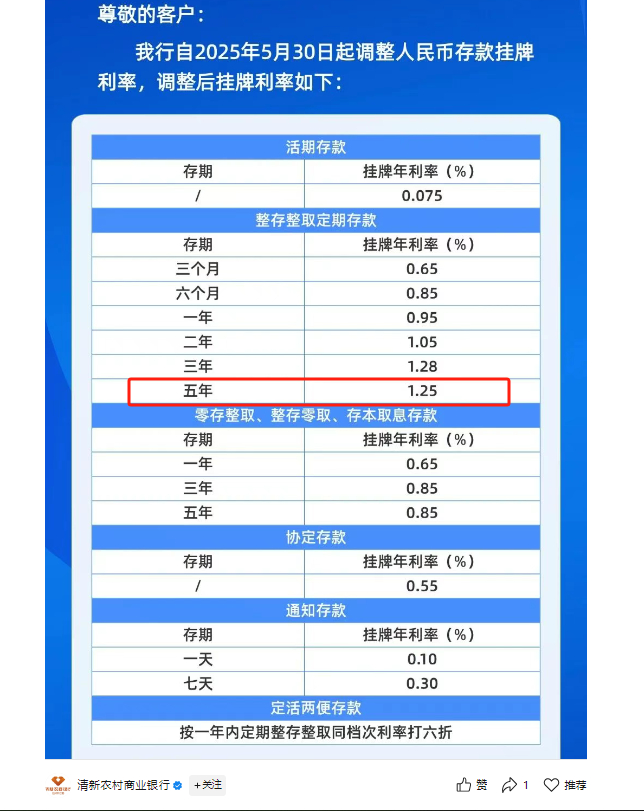 5月30日,广东清新农村商业银行发布公告,即日起调整人民币存款挂牌利率,五年期整存整取定期存款利率降至1.25%。
