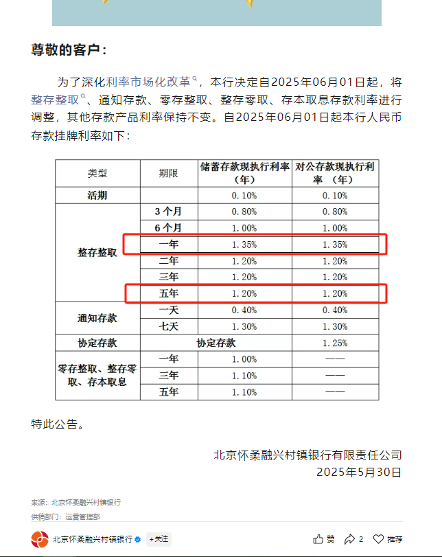 北京怀柔融兴村镇银行今日也宣布,6月1日起调整人民币存款挂牌利率,3个月、6个月、一年整存整取定期存款利率分别执行0.80%、1.00%、1.35%。而二年、三年、五年整存整取定期存款利率统一执行1.20%。