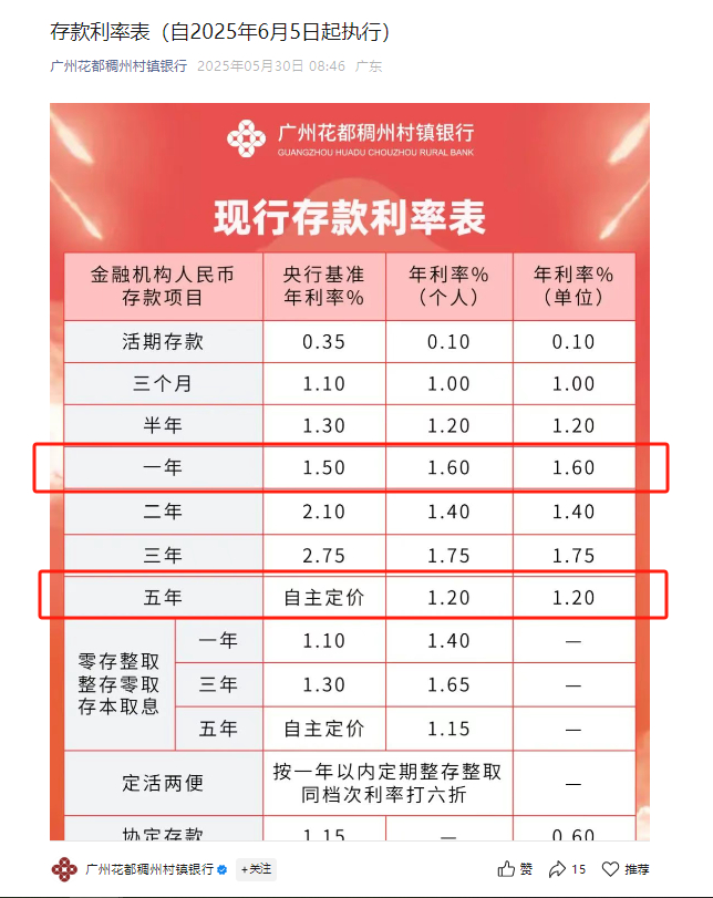 同日,广州花都稠州村镇银行也宣布,自6月5日起,半年期、一年期、二年期、三年期、五年期整存整取定期存款利率分别为1.20%、1.60%、1.40%、1.75%、1.20%。