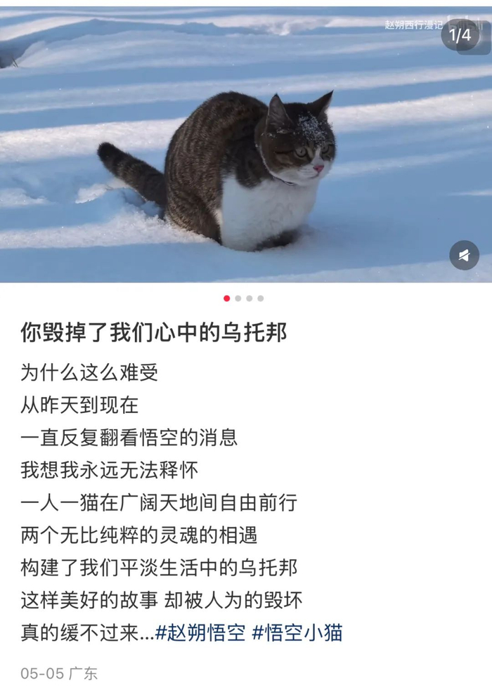 朱茗持续关注网上更新的信息,自己也随之忍不住“一波三折”地揪心:最初以为悟空遭遇车祸的时候,她只是“感叹命运无常”,继而发现可能被毒杀,她联想到虐待虐杀动物现象频繁,“人类竟然容不下一只小猫”,无力和失望接踵而至。