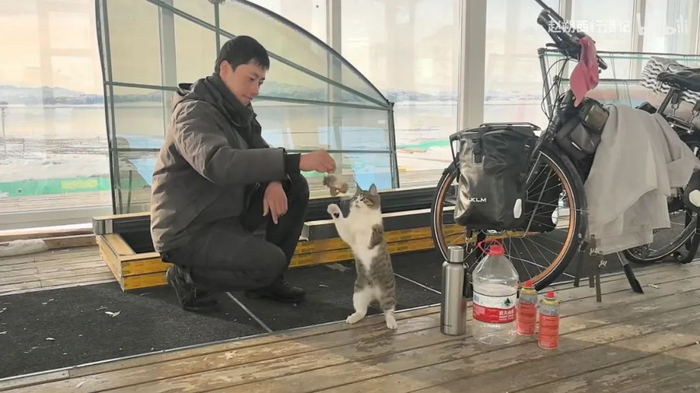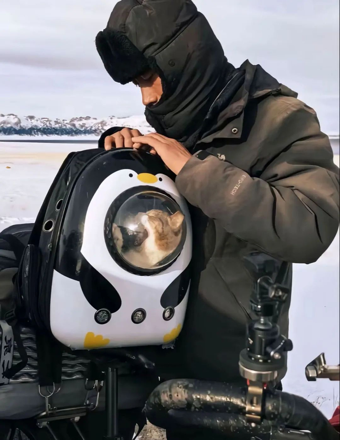 小猫名叫“悟空”,是一只狸白相间的简州猫。2024年10月30日,它偶然闯进了骑行博主赵朔的帐篷。新疆阿勒泰喀纳斯村庄里,凌晨4点的雪夜,赵朔被帐篷外的猫叫吵醒。他拉开帐篷,让小家伙进来,小猫主动往赵朔怀里拱。从此,赵朔带上它,一人一猫,一路西行。