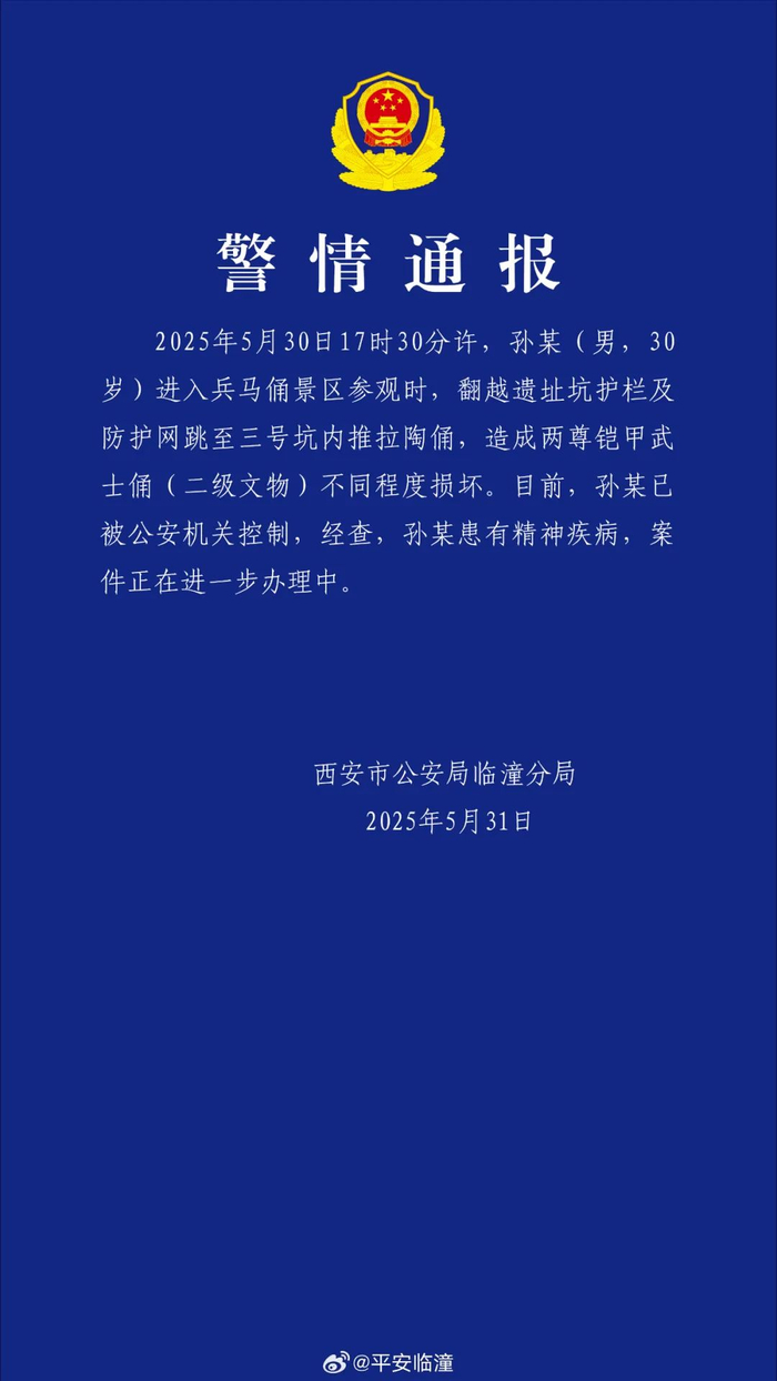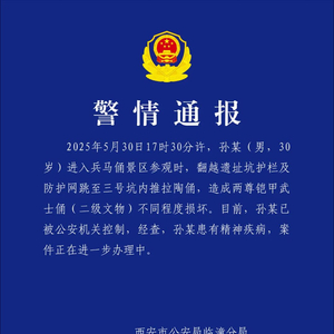2025年5月30日17时30分许,孙某(男,30岁)进入兵马俑景区参观时,翻越遗址坑护栏及防护网跳至三号坑内推拉陶俑,造成两尊铠甲武士俑(二级文物)不同程度损坏。目前,孙某已被公安机关控制,经查,孙某患有精神疾病,案件正在进一步办理中。