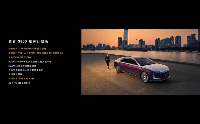 尊界S800 搭载分布式数控柔性平台,配备全域融合架构,通过途灵龙行平台实现主动感知、中央控制、智能推理、自主学习。车辆匹配 HUAWEI DriveOne 800V 高压碳化硅电机,双电机最大输出功率 390kW、三电机最大输出功率 635kW。车辆配备前双叉臂、后五连杆,匹配双腔空气悬架和连续可变阻尼减震器,搭载首创时空推理悬架,实现连续空间模型构建,号称路况空间模型的分辨率提升 100 倍,同时实现全路况无感爆胎稳定控制。
