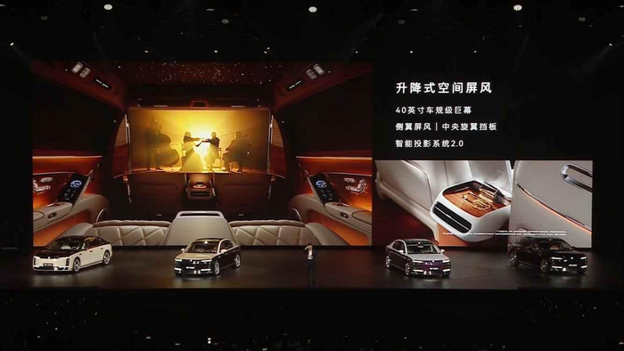 此外,车辆还搭载了隐私光幕玻璃,支持手势调光,响应时间≤1 秒,折光率≥99.6%,升降式空间屏风包括 40 英寸车规级巨幕、侧翼屏风、中央旋翼挡板,还搭载了智能投影系统 2.0,可实现前后排互不干扰。