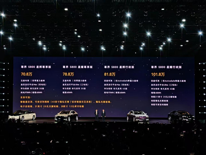 5月30日,华为鸿蒙智行发布会上,华为常务董事、终端BG 董事长余承东公布了尊界S800 的内饰及配置信息。 中国品牌的超豪华D级轿车终于来了,尊界S800 作为尊贵豪车的代表,犹如一颗璀璨新星,彰显了科技魅力与优雅设计的完美结合。尊界 S800售价区间为 70.8 万 - 101.8 万元的高端座驾,以其独特的魅力、卓越的性能和丰富的配置,为追求极致尊贵出行体验的用户带来了全新的选择。